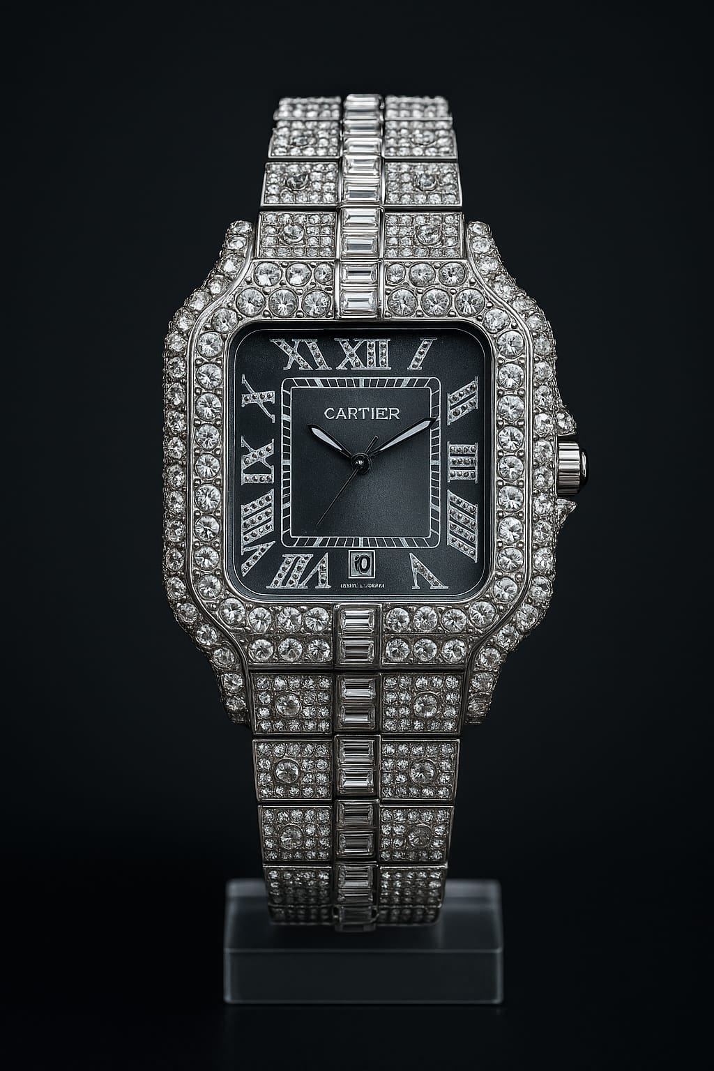 Make your wrist shine with confidence and elegance. This Bust Down Millionaire Watch in premium silver finish is iced out with 20 carats of top-grade Moissanite stones, giving you that ultra-luxury look — for a fraction of the cost.